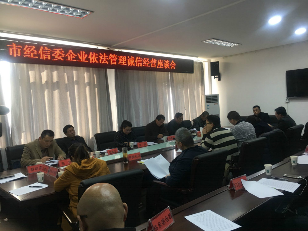 11月23日下午, 淮安市淮阴区召开依法管理诚信经营工作专项调研会,市经信委、市企业法制工作协会、区政法委、区经信委相关领导、专家以及12家申报企业负责人参加了调研会。