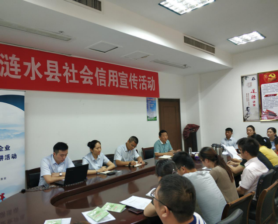 8月9日上午,涟水县举办社会信用体系建设集中宣传活动,主要包括社会信用体系建设知识讲解、打造“诚信档案”及诚信经验交流学习,县信用办全体人员和部分优秀企业家代表参加。