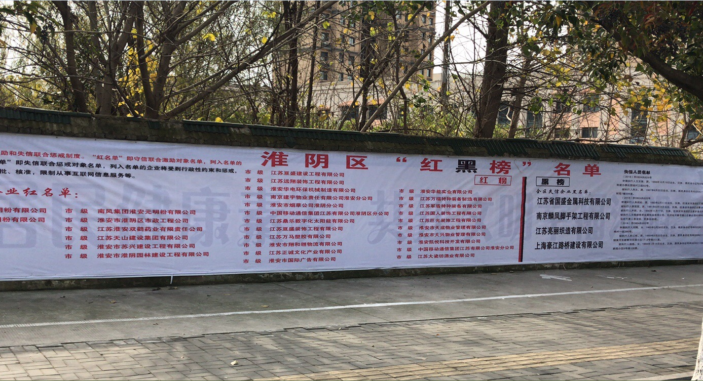 为积极创建“诚信示范街区”,结合“红黑名单”进社区活动,大力发掘和宣传诚信企业、诚信人物、诚信群体,在全社会营造诚实守信的浓厚氛围,充分发挥先进典型示范引领作用。淮安市淮阴区信用办、文明办、市管局联合在“幸福街”“淮海北路-银川路”设置三处“淮阴区红黑榜公示”专栏,目前已更新二、三季度红黑榜,公示全区优秀诚信企业、“重合同 守信用”的国家级、省级、市级企业77家,8家黑名单,还有20余条失信被执行人人员信息,起到了良好的宣传警示作用。