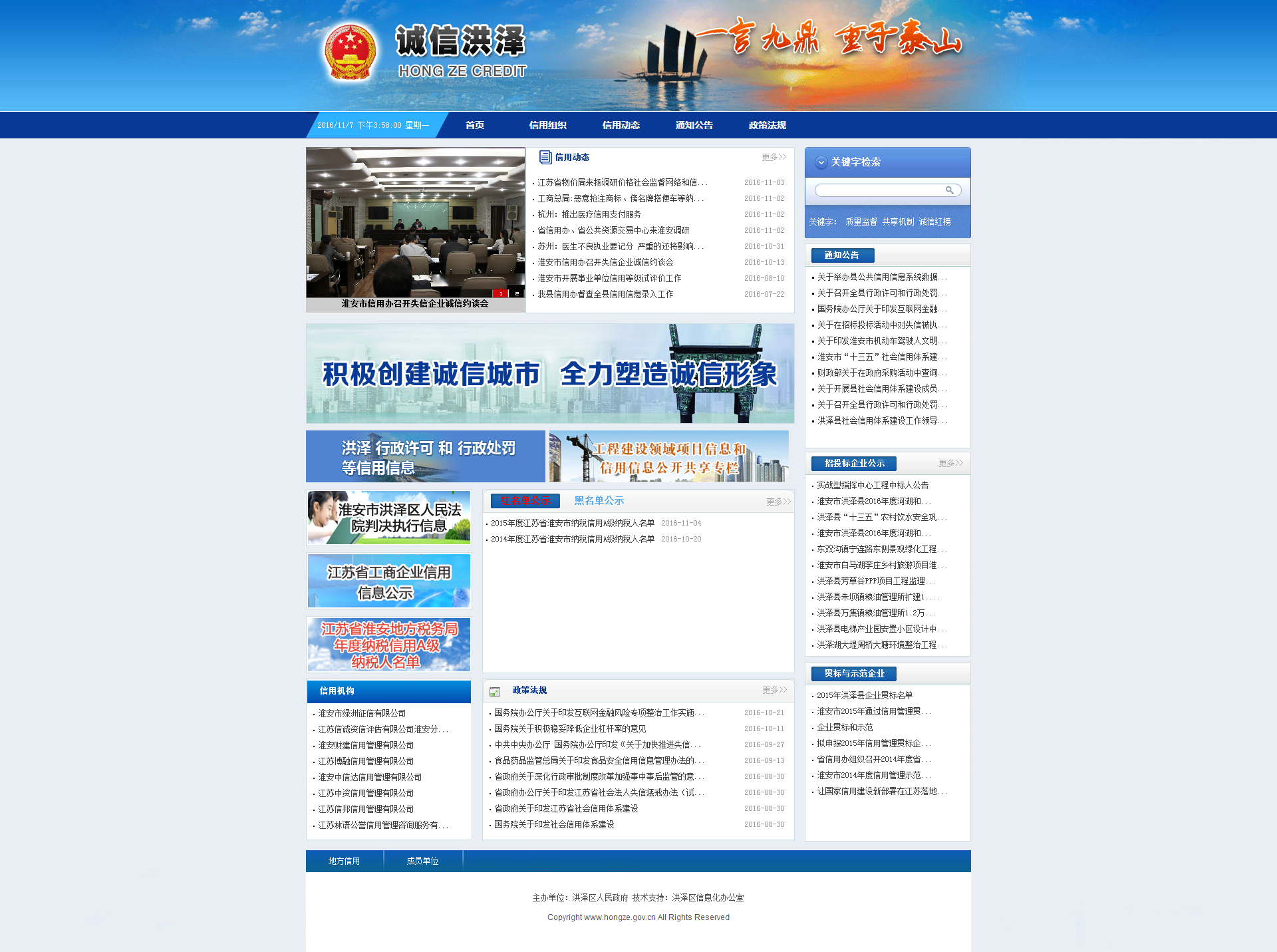 为加强对外宣传诚信洪泽,让市民树立诚信意识。根据市信用办要求县、区须创建诚信网站,诚信洪泽网站于6月份开始筹建,11月份正式上线。诚信洪泽网站主要分为信用动态、红黑名单公示、信用机构、信用政策法规、贯标与示范企业、招投标企业公示等栏目,网站的创办让洪泽的社会信用体系建设工作有了自己的阵地和对外宣传平台。(洪泽区信用办供稿)