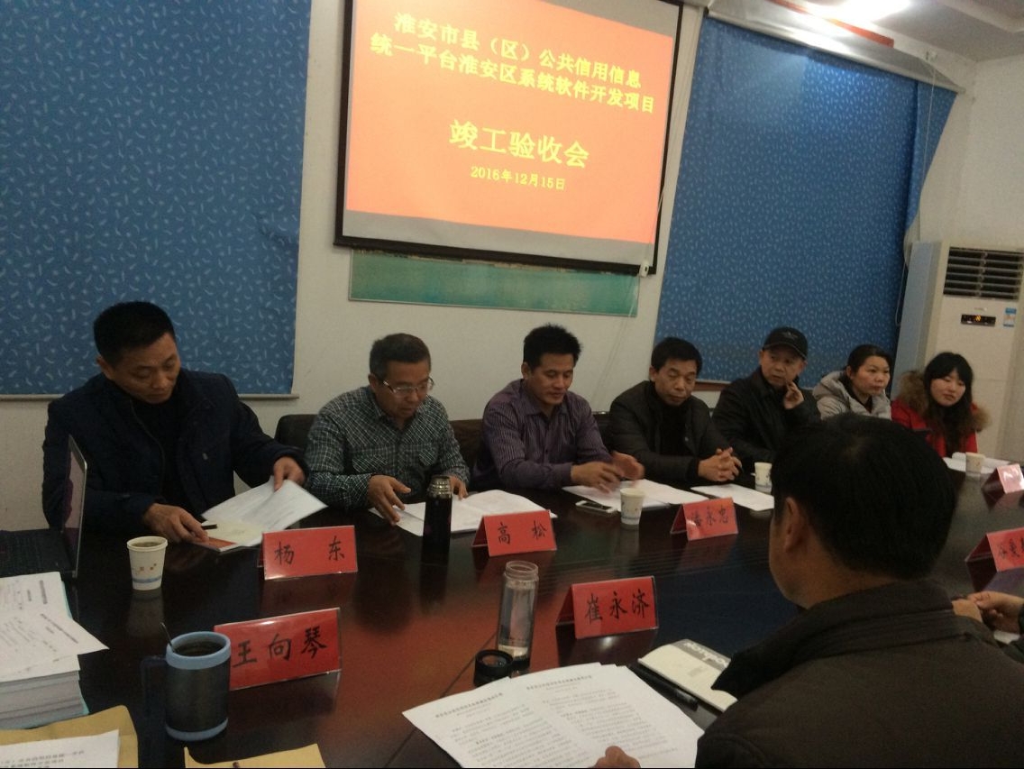 2016年12月15日,淮安市淮安区经济和信息化委员会组织召开了“淮安市县(区)公共信用信息统一平台淮安区系统软件开发项目”验收会。专家组审阅了文档资料,观看了系统在线演示,经过质询和讨论,同意通过项目验收。