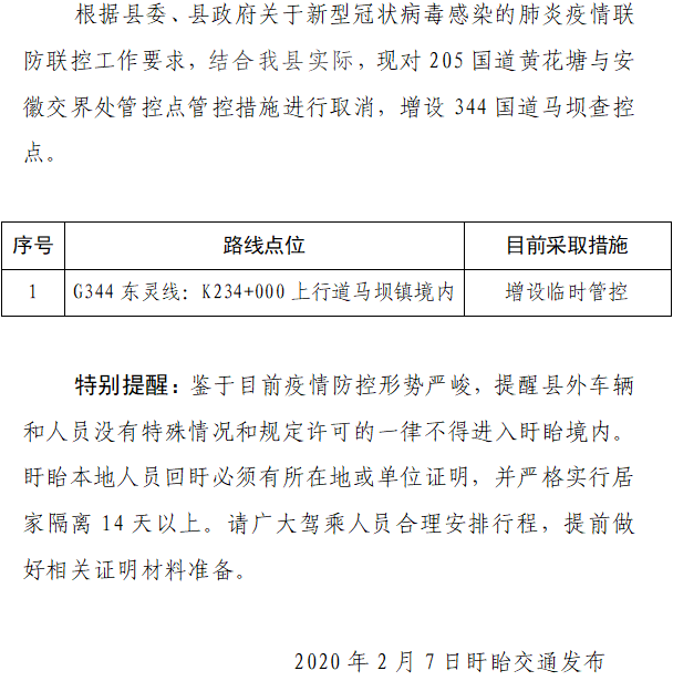 【抗击新型冠状病毒专题】盱眙县路网情况发布4号公告